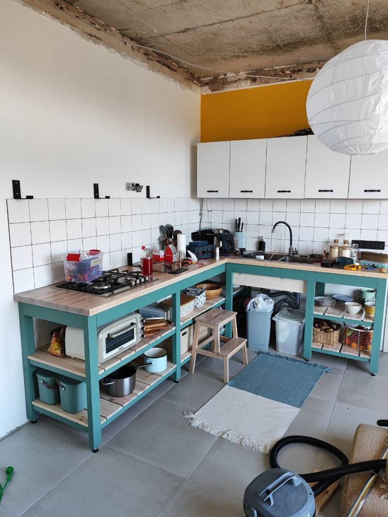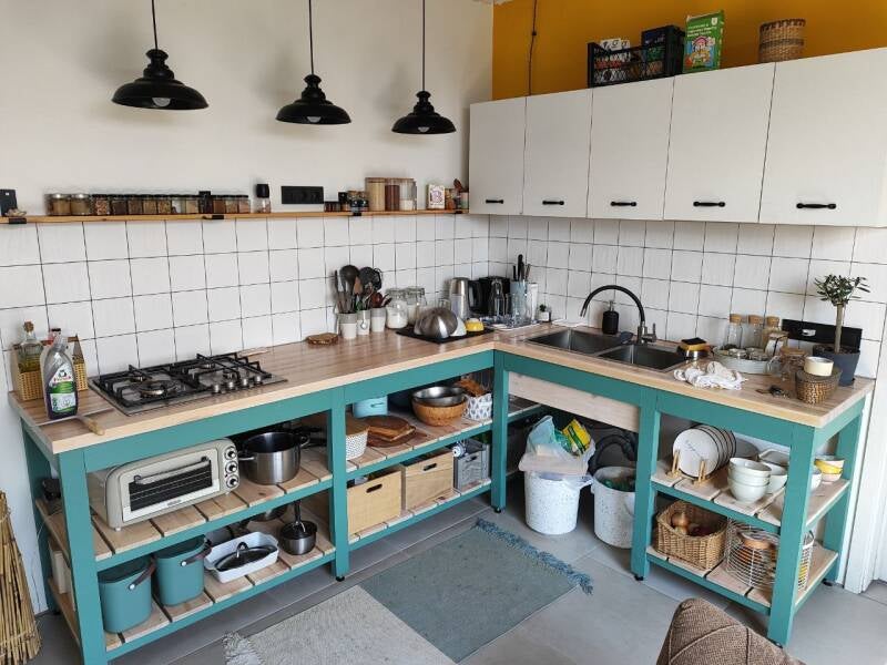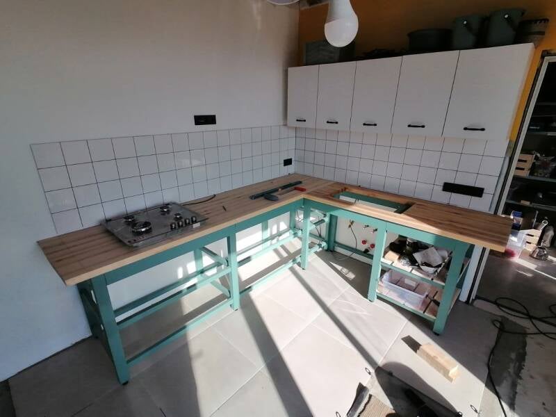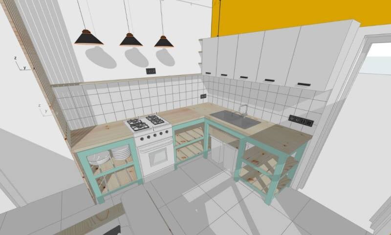 Then I started to do the rest of kitchen cabinets, standing on the floor. I did them out of pine wooden blocks, sanded and painted, and I used a Kreg plug cutter to connect the parts. I did them without any doors because it's faster and cheaper, and I wasn't sure that I could handle with making the doors by myself.