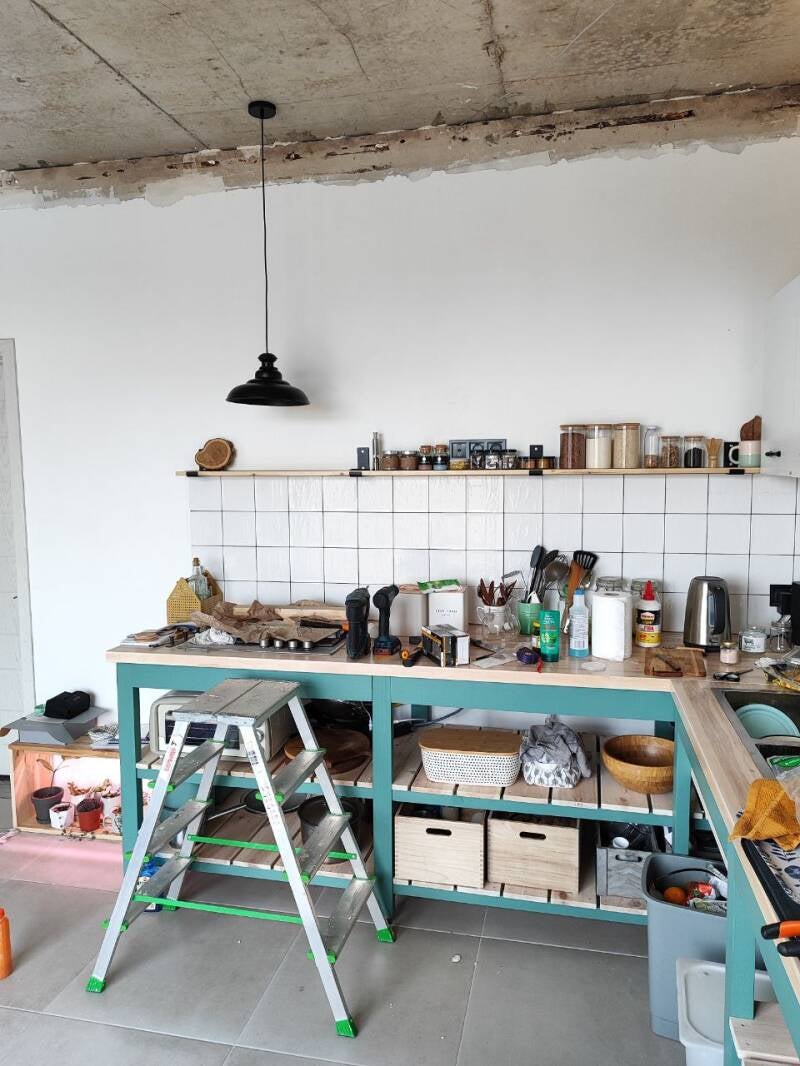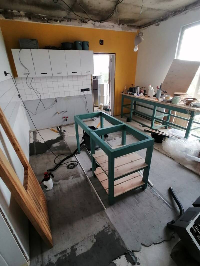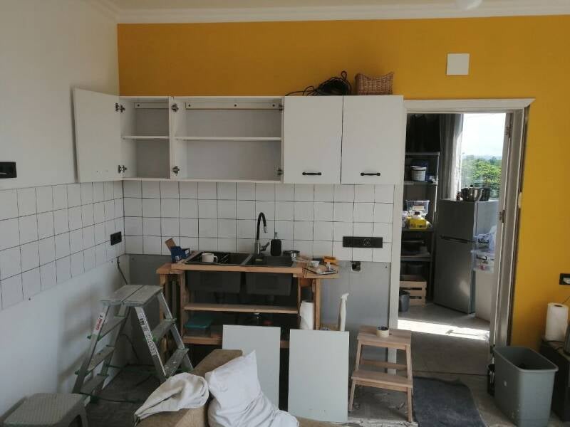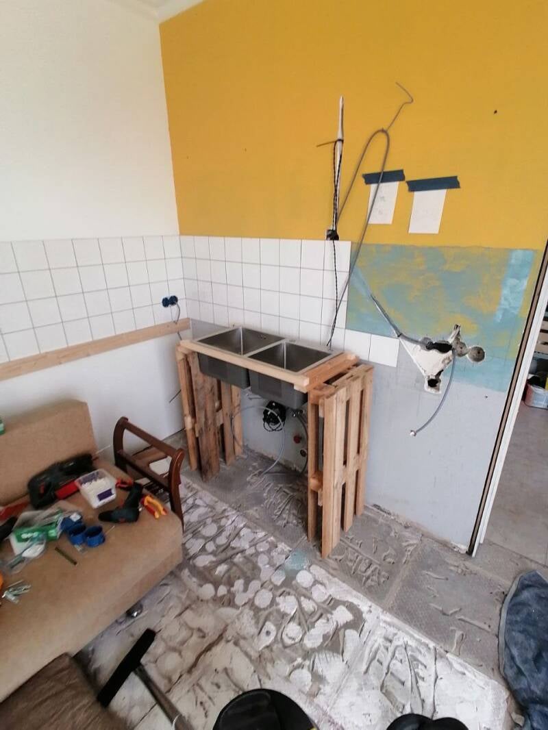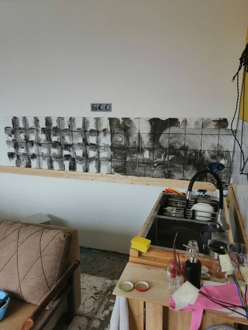 Also I removed old tiles from the floor and made a huge kitchen backsplash and some electrisity wiring stuff behind the cabinets, extra sockets. extra switchings, extra lightings. I bought a sink and made an ugly temporary stand for it, because we were living in this house, while I was doing all of this.