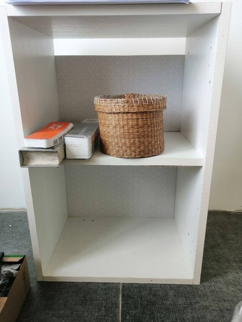 Then I used an old kitchen cabinets, that went with this house, but I rennovated them a little, because their backparts were made of very cheap material and they were damaged by the mould. So I scraped off this part, threw it away, and made a new one out of thin plywoood, that I covered with wallpaper.