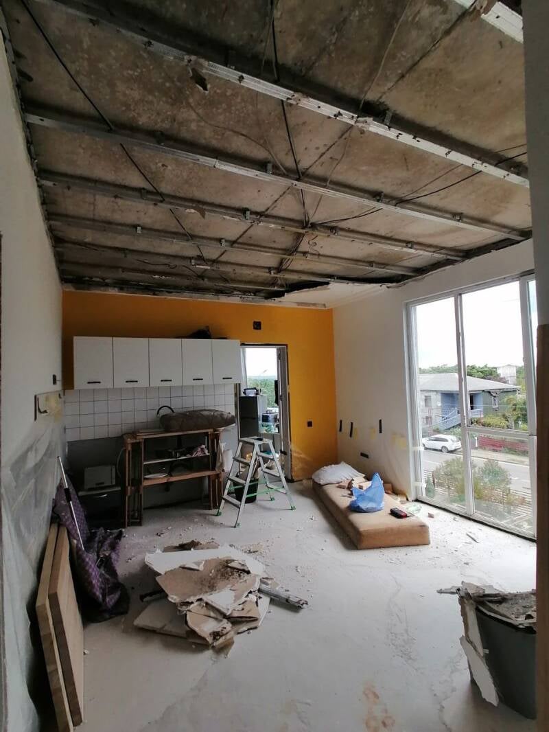 Meanwhile we've got a problems with the roof, it was a very rainy and wet winter, so the roof leaked totally, the water was dripping at my face inside the house. We covered the roof with some new material, but the drywall layer on the ceiling was completely wet, and there was mold everywhere on the ceiling, so I had to remove it. I was very angry, because I freshly painted the walls and the ceiling a couple of month before that.