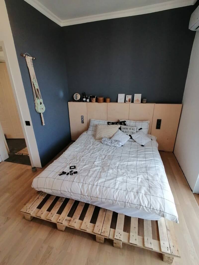 I made the bed from 4 pallets, that I've cutted because I get them for free from some vine workshop and it took me very short time to do it. Two nightstands are made of pine furniture panels scraps.
